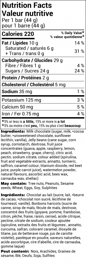 Rogers’ decadent 33% milk chocolate combined with naturally flavoured Peach, Lemon, Apple, Tart Cherry, Grape, Watermelon, Raspberry, Strawberry, Guava and Coconut jelly beans. These aren't just for kids!