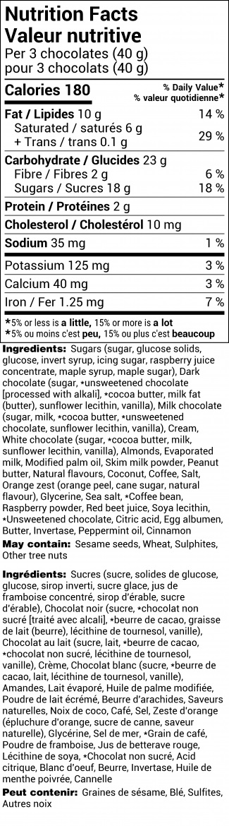 An impressive selection of Rogers' best milk and dark chocolates, 114 in total, presented in two layers. Includes Mini Victoria Creams, Truffles, Almonds, Empress Squares, Mini Bars, Nougat, and Caramels. Assortment may not be exactly as shown.