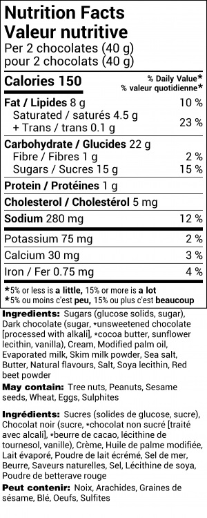 A checkerboard of pink and white sea salt caramels with just the right balance of sweet and savoury. Assortment may not be exactly as shown.