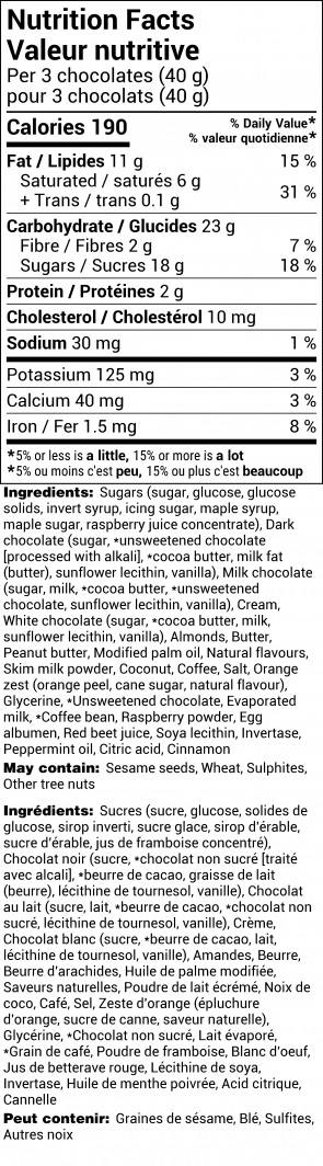 This 28 piece assortment contains milk, white and dark chocolates including mini creams, chocolate-covered almonds, truffles, Empress Squares, butter caramels and mini bars. Assortment may not be exactly as shown.