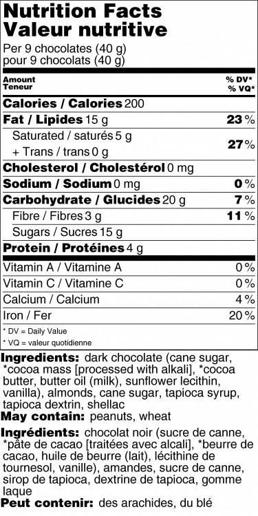 Roasted almonds coated in our rich, dark chocolate. The resealable bag lets you snack on some now, and keep some for later ... if you can resist!