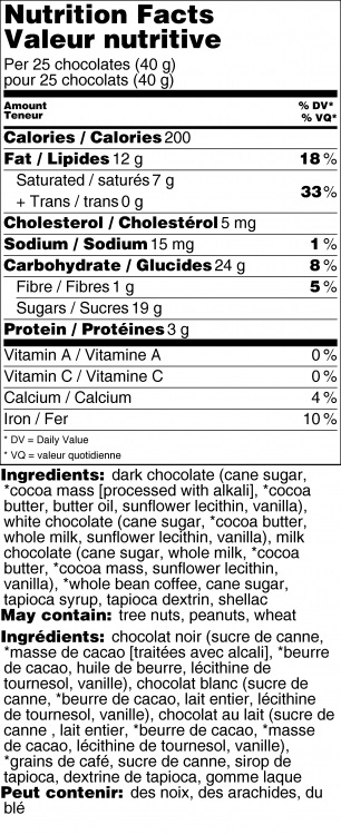 Rich, Italian roast espresso beans lavished in premium milk, dark, and white chocolate. The resealable bag lets you snack on some now, and keep some for later ... if you can resist!