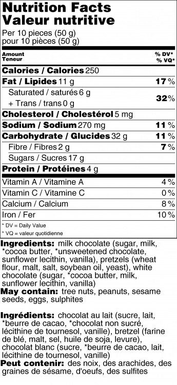 Crispy, salted, fine pretzels covered in 33% milk chocolate and drizzled in couverture white chocolate.