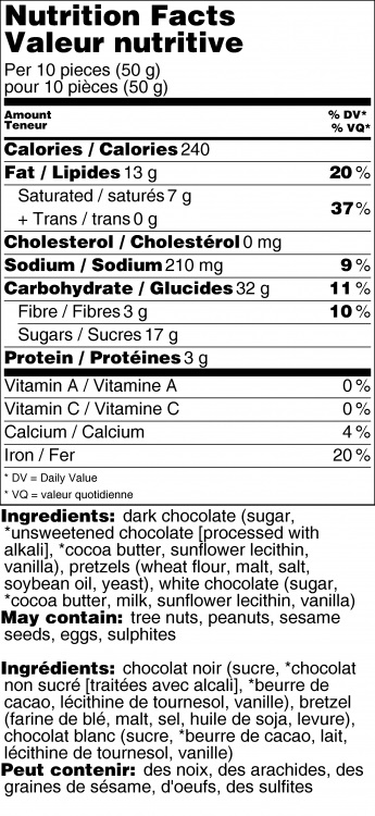 Crispy, salted, fine pretzels covered in 54% dark chocolate and drizzled in white chocolate.